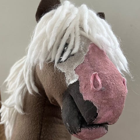 Mustasta pörrökankaasta käsintehty keppihevonen. Harja ja korvat ovat ommeltu kiinni kankaaseen. Korvat ja sieraimet ovat mustaa tekonahkaa ja ne ovat liimattu kiinni. Keppihevosen mukana ei tule keppiä.