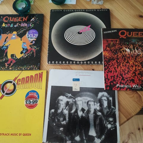 1.) QUEEN – JAZZ (1978 Japanese Pressing)Me olemme iloisia voidessamme esittää aitonkeräilijäyksilön Queenin ikonisen vuoden 1978 albumin "Jazz" todellista keräily-aarretta. Yksi bändin legendojen monipuolisimmista ja näyttävimmistä levyistä, tämä albumi oli tottelematon nimeään kohtaan, tarjoten loistavan puhtaasti genre-sävyiltään epäuskollisen kokonaisuuden. Sen sijaan se tarjosi upean rockin voimanäytteen, ulottuen jylisevän, jalkapallostadion-anthemimaisen "We Will Rock You" -teoksen ja sen rinnakkaisversion "We Are The Champions" sekä vaudeville-tyyppisen kampin "Don't Stop Me Now", hard rockin "Fat Bottomed Girls" sekä leikkisän, vaudevillin inspiroiman "Bicycle Race". Albumin monimutkainen gatefold-kotelo, joka sisältää ranskalaisen Richard Gray'n maalauksen ikonisen muraalimaalauksen, oli yhtä kunnianhimoinen ja mieleenpainuva kuin musiikki itse, ja vahvisti Queenin mainetta suuresta spektaakkelista.Tämä on kiistaton ja erittäin haluttu ensimmäinen japanilainen blastin Elektra-merkinnällä. Tämän aikakauden japanilaiset painokset ovat legendaarisia audiofaneille niiden erinomaisen äänenlaadun vuoksi, hyödyntäen premium-vinyliä ja huolellista masterointia, jotta Queenin musiikin täydellinen dynamiikka-alue ja monimutkainen tuotanto välittyvät upealla kirkkaudella ja lämmöllä. Alkuperäisen OBI-ruudun, kuvituksen sisältävän sisäkantta, alkuperäisen kappaleen sanoitusten insertin sekä harvinainen ja erittäin keräilyarvoinen taitettavissa oleva juliste levyn kuuluisasta polkupyöräkilpailun kohtauksesta tekevät tästä täydellisen japanilaisen paketin korkeimman luokan.Noutovalmentuneelle keräilijälle tämä kappale edustaa vahvaa ja rehellistä esimerkkiä tästä peruslevystä. EX-luokitus media lupaa vahvan, nautittavan toiston minimaalisilla pintakohinoilla. EX-kotelo esittää hyvin, vaikka takakannessa on muutama pienempi syöppövlekki, jonka ikävastineen säilytys on odotetun kaltaista. OBI-ruutu, vaikka täydellinen, sisältää pienen repeämän alakulmassa oikealla, mikä on huomioitu täysin läpinäkyvyyden vuoksi. Tärkein insert, sekä ikoninen juliste ovat molemmat läsnä. Se on upea, aito Queen-historian kappale kullekin vakavasti keräilijälle.YKSITYLLISESTI TIEDOTTaiteilija: QueenOtsikko: JazzFormaatti: Vinyl LP, Ensimmäinen japanilainen painos, Gatefold Maa ja vuosi: Japani, 1978 Merkki ja kataloginumero: Elektra – P-10601E Media-tila: EX (Erinomainen). Vinyli on erittäin hyvässä kunnossa, näkyvissä on joitakin aiemman soiton merkkejä, kuten kevyet pintakohmelut ja hiusraitoja. Soitossesti varmistukset osoittavat, että nämä aiheuttavat vain satunnaista, kevyttä taustamelua eivätkä häiritse musiikkia. Ei hyppyyksiä eikä merkittäviä vääristymiä. Se on vahva, nautittava soittokappale, joka on ammatti- puhdistettu. Kansi-kunto: EX (Erinomainen). Alkuperäinen gatefold-kansi on hyvä ja rehellinen. Aikaiskuukautisten merkkejä ja varovaista varastointia on ilmeisesti ilmeisessä määrin, reunan ja kulmien kulumista odotetulla tavalla. Erikoisesti takakannessa on muutama pieni tahran jälki. Selkä on vahva ja täysin luettava, ja taide säilyy eloisana. Gatefold itsessään on ehjä ja täysin toiminnallinen.Sisältyy: TÄYDELLISET. Tämä kappale sisältää kaikki alkuperäiset japanilaiset elementit: OBI-ruutu (täydellinen, mutta alas oikealla kulmalla pieni repäisy), originaali insert, alkuperäinen kuvitettu sisäkansi sekä erittäin keräilyarvoinen taitettava juliste.RAIDLISTASivu Yksi:1. Mustapha2. Fat Bottomed Girls3. Jealousy4. Bicycle Race5. If You Can\'t Beat Them6. Let Me Entertain You