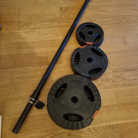 Ylimääräiseksi jäänyt levytanko ja 8 kpl painolevyjä (4x12 kg, 4x4 kg). Tanko n. 12 kg joten koko setti yhteensä noin 76 kg. Tangon pituus 200 cm ja halkaisija 30 mm. Omavalmiste, tanko ei ole laakeroitu eikä sisällä lukkoja. Sopii voimaharjoitteluun ja peruslihaskuntoharjoituksiin kotisalilla. Vain nouto.
