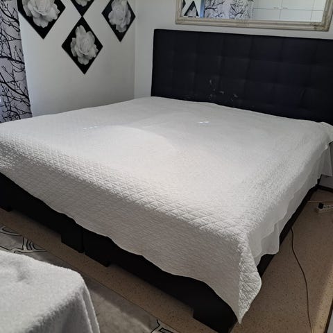 Myydään muuton vuoksi iso ja näyttävä sänky, jossa pääty ja sängyn runko on verhoiltu mustalla sametilla. Kokonsa vuoksi sänky vaatii ison makuuhuoneen.