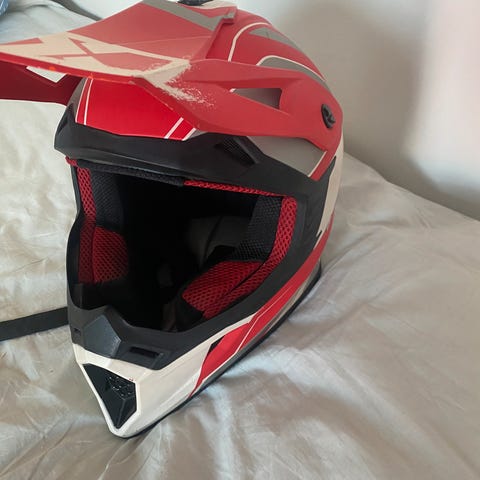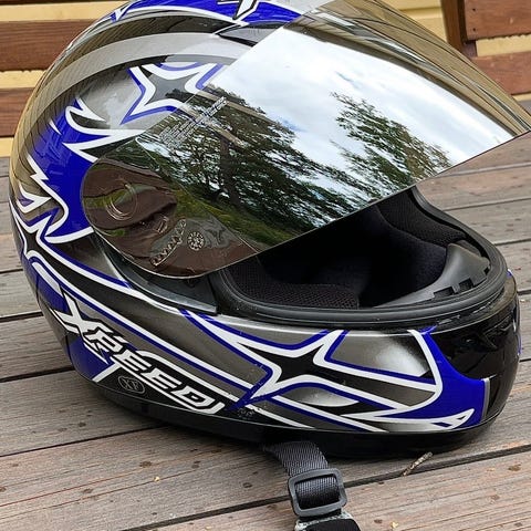 Moto täyskypärä moottoripyörä- tai mopokäyttöön. Kypärässä on musta-hopea kuviollinen ulkopinta ja kirkas visiiri. Yläosassa on ilmanvaihtoaukkoja. Soveltuu pään suojaamiseen tieliikenteessä tai muussa ajokäytössä, jossa vaaditaan täyskypärä. Käytetty vaan väliaikaisesti kun liian isovain nouto länsinummesta maksu käteinen