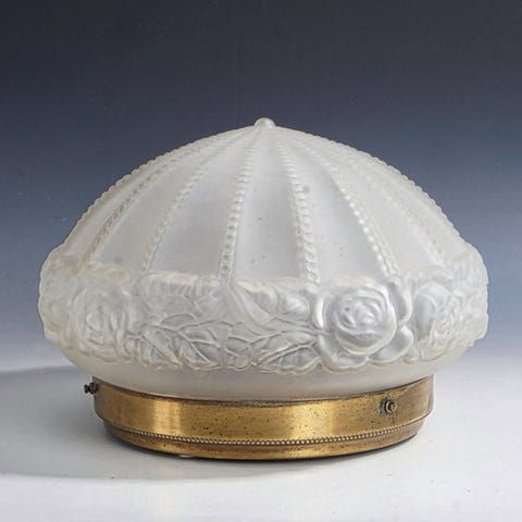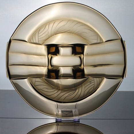 KuvausElegantti Art Deco -lautanen/levy "Irene" Walther & Söhne AG:lta, toteutettu harvinaisen syvän violetin värisenä. Tämä malli kuuluu yrityksen ylellisimpiin puristuslasiesineisiin, joille ominaista ovat sulavat linjat ja veistoksellinen muoto, joka on sekä koristeellinen että toiminnallinen.Lautanen on vaikuttavan leveä, 33 cm, ja korkeus 9 cm, mikä tekee siitä silmiinpistävän keskuskohdan pöydälle, sivupöydälle tai vitriinikaappiin.Väri & MateriaaliSyvän violetin puristelas, väri, jota on tuotettu varsin vähän ja jota keräilijät arvostavatTiivistetty, kirkkaasti puristettu lasi, jolla on kauniita valonheijastuksiaTyypillinen Art Deco -muotoilu: symmetria, syvyys relieffissä ja terävä siluettiKuntoHyvässä vintage-kunnossa, pienet jäljet iän mukaisesti. Ei halkeamia. Lautanen osoittaa kaunista kiiltoa ja teräviä yksityiskohtia lasissa.ErikoispiirteetMalli „Irene“ on klassikko Walther & Söhne -valikoimassa ja tunnistettavissa pehmeiden pyöreyksien ja tiukan geometrian yhdistelmästäDankziel de kleur en maat ideaal als fruit- of presentatieschaal, mutta myös erittäin sopiva puhtaaksi koristeelliseksi Art Deco -objektiksi