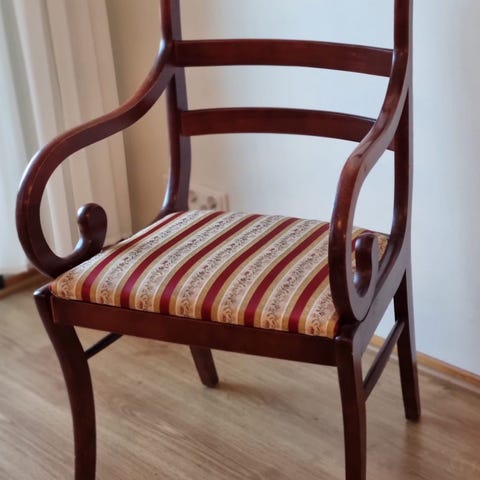 Nojatuoli, jossa vaalea kangasverhoilu ja puujalat. Tuolissa on korkea selkänoja, kevyesti kaartuvat käsinojat ja napitettu selkäosa. Sopii esimerkiksi olohuoneeseen tai lukunurkkaukseen istuimeksi. Verhoilussa on näkyvää kulumaa ja tahroja, joten tuoli voi soveltua myös kunnostus- tai verhoiluprojektiin.