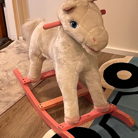 Täysin ehjä ja tukeva, mutta pinnaltaan hieman kärsinyt kotimainen keinuhevonen.