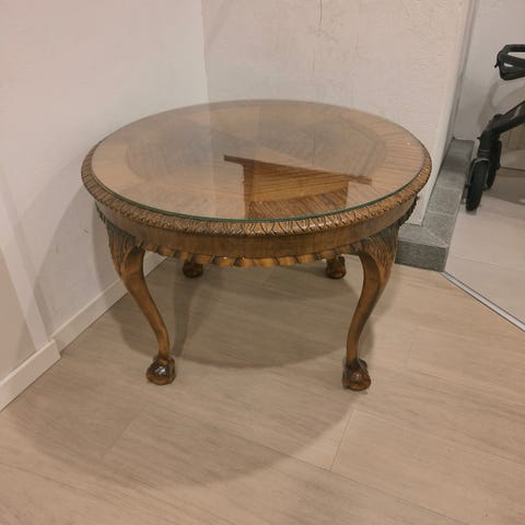 Kauniin ovaalin muotoinen antiikki messingin värinen tarjoilupöytä.