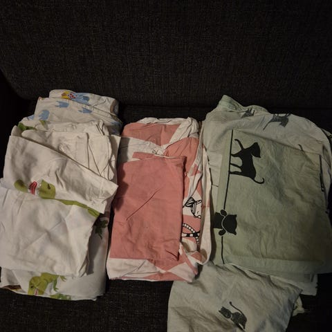 Annetaan tarpeettomana kuvien mukaiset tyynyliinat, pussilakanat, lasten kangas. Ryppyisiä säilytyksestä, muuten ehjiä/käyttökelpoisia.