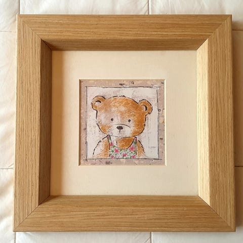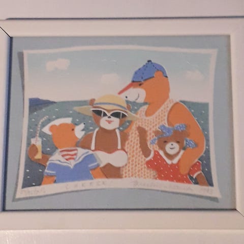 Nalleaiheinen taulu, jossa kuvattuna valkoiseen liiviin ja hattuun pukeutunut nalle. Taulussa on suorakaiteen muotoinen kuva ja takana ripustuskiinnike seinälle laittamista varten. Taustan väri on tumma, ja taulu sopii esimerkiksi lastenhuoneen tai muun tilan sisustuselementiksi.