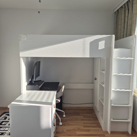 Hyväkuntoinen Ikean Stuva-parvisänky (nykyisin Småstad). Eroaa Småstadista siinä että kaapin paikkaa ei voi vaihtaa sängyn vasemmalle puolelle.