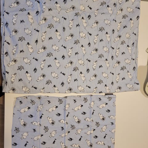 Finlaysonin junioripeittoon sopiva pussilakanasetti Muumi-kuosilla. Settiin kuuluu pussilakana ja tyynyliina. Puuvillaa.