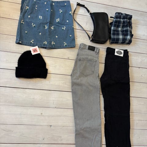 Vaaleissa farkuissa on todella pieni ja haalea tahra. Vaatteiden koko on XXS-M, mutta suurin osa on XS.