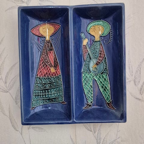 Seinälautanen Järvi -aiheinen koristevati. Lautasessa on värillinen maisemakuva järvestä, veneestä ja koivumetsästä. Taustapuolella on ripustuslenkki seinälle kiinnittämistä varten. Soveltuu sisustuselementiksi tai keräilyesineeksi. Design Veikko Matti Mäkitalo.