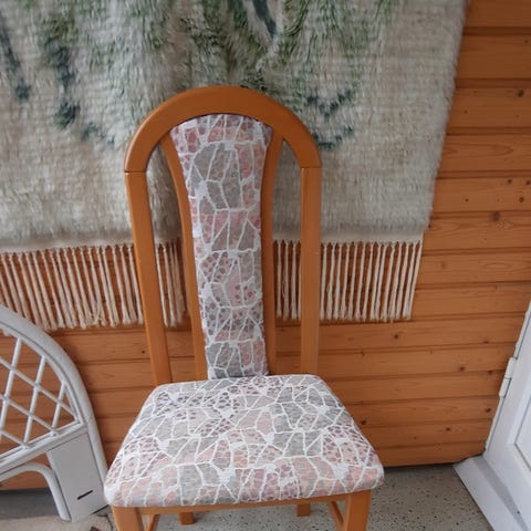 Annetaan 2 Rokokoo tuolia. Tuoleissa kangaspäällinen, mikä on ehjä. Myös jousitus ehjä. Puuosat kuluneet ja vaativat kunnostusta.