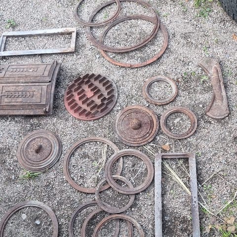Muurattavan hellan osat, uuninluukut, nuohousluukkuja ja savupeltejä. H.alk.