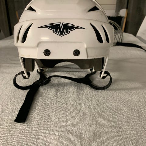 Nike Bauer jääkiekkokypärä valkoinen. Kypärässä on useita ilmanvaihtoaukkoja ja pehmustettu sisäosa. Säädettävä leukahihna ja sivuilla säätömekanismit koon hienosäätöön. Soveltuu jääkiekon pelaamiseen, koko n. 65.