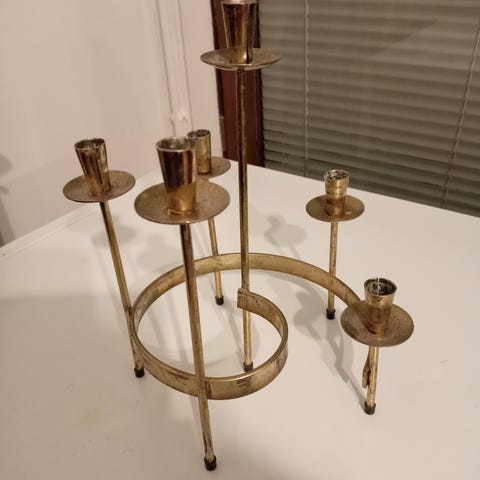 Gunnar Anderin 60-luvulla suunnittelema messinkinen Spiral -kynttelikkö, valmistettu ruotsissa. Korkeus noin 24 cm. Kuudelle kynttilälle, joiden halkaisija enimmillään noin 1,5cm.