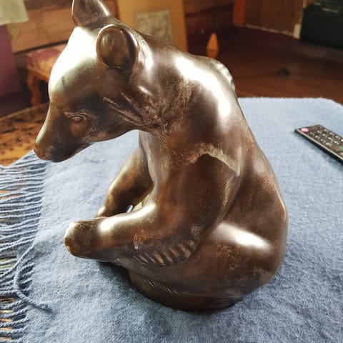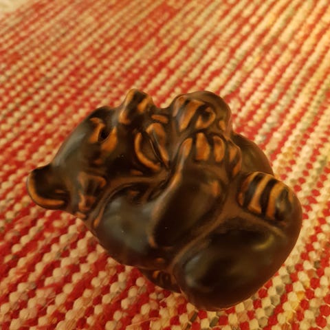 Mammutti kivitavarafiguuri. Ruskea- vihervä marmorikuvioinen pinta. , Pohjassa valmistajan merkinnät ja tarrat. Wolmer 20186, K, Denmark sekä kolme aaltoa (Royal Copenhagen) . Suunnittelu Knud Kyhn. Korkeus noin 10 ja pituus noin 13-14. Esine on täysin virheetön.