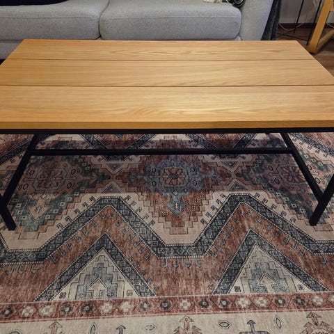 Tukeva ja tilava sohvapöytä. Muutama pieni kolhu, mutta yleisilme erittäin siisti.