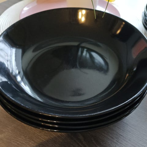 12 kpl käytettyjä, mutta ehjiä, mustia Ikean matalia lautasia. Halkaisija n. 27cm.
