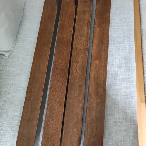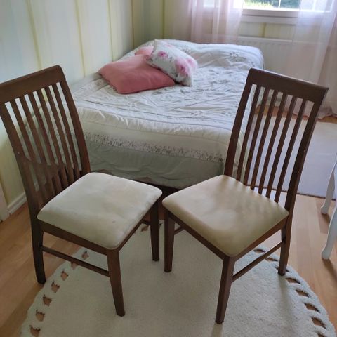 Hyväkuntoinen ja tukeva pieni ruokapöytä. Ainut moite yhdessä jalassa oleva naarmu, näkyy kuvassa. Petsattua massiivipuuta, mäntyä. Malli Vesa. Kulkeutuu lähes päivittäin Seinäjoelle.