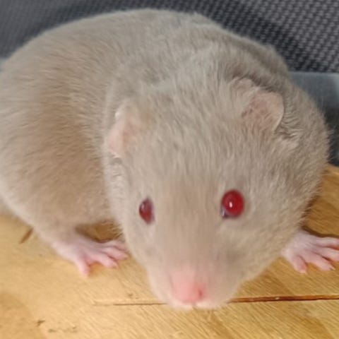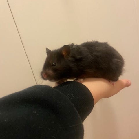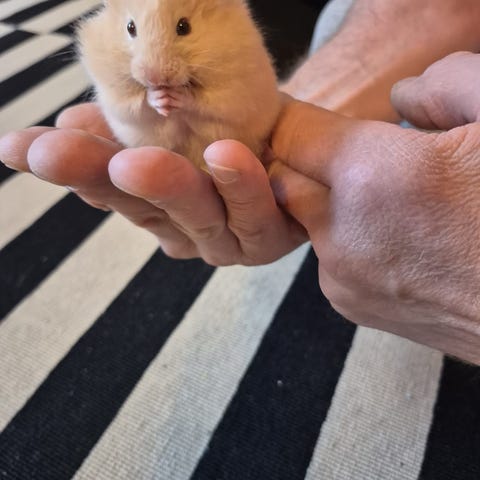 7.7.2025 syntynyt syyrianhamsteri naaras loppuelämän kotia vailla. Erittäin utelias tapaus, kuitenkin käsittelyssä ajoittain malttamaton (niinkuin nyt kuvatessa). Mielellään tutkii asumuksen ulkopuolista turvallista rajattua ympäristöä. Asumuksessa pääosin rauhalliset menot, naaraiden tyypillinen kaikenaikainen tekemisen tarve melko vähäinen.