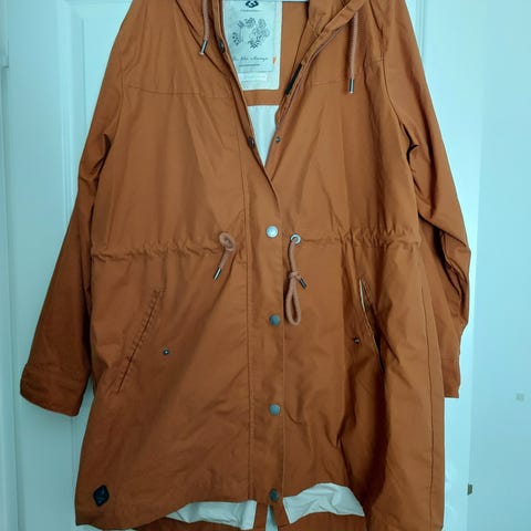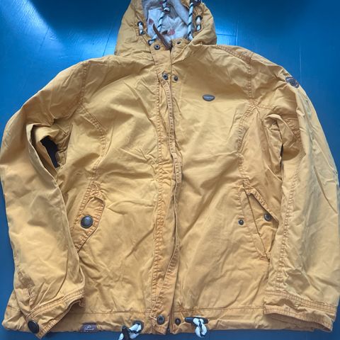 Hyväkuntoinen ja ehjä takki, jossa huppu. Kiristysnyörit helmassa, vyötäröllä ja hupussa. Vetoketju toimii hyvin.