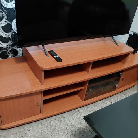Kuvan mukainen tv-taso. Käytönjälkiä on, isoimmista jäljistä kuvat ilmoituksessa. Vain nouto. Noin ~120 cm leveä