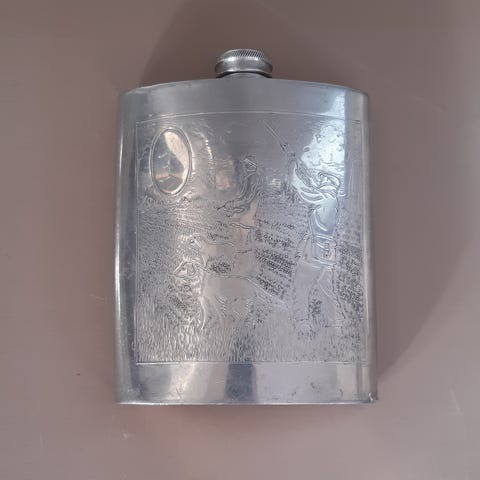 North State taskumatti, materiaali ruostumaton teräs. Ulkopinta on metallinhohtoinen, toisella puolella kuvioitu pinta ja pieni laatta, jossa teksti "North State 60 vuotta 1999". Sopii esimerkiksi juomapulloksi pienten nestemäärien kuljettamiseen. Kierrettävä korkki on kiinteästi kiinni taskumatissa, mikä helpottaa käyttöä ja ehkäisee korkin katoamista.