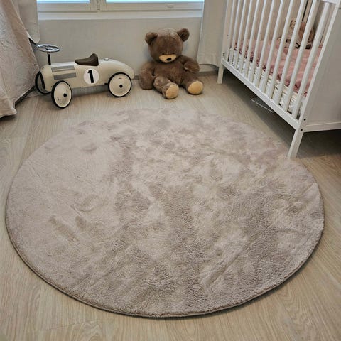 Pyöreä ruskea matto, halkaisija 160 cm. Materiaali polypropeeni, pohja lateksia, joten pysyy hyvin paikoillaan. On ollut käytössä muutaman kuukauden