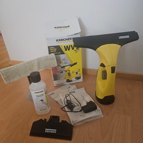 Laite ikkunan puhdistukseen ja kuivaukseen. Kaikki toimii ja pelittää. Mukaan kuivain, laturi, sumutepullo rättipidikkeellä ja yksi ikkunarätti.