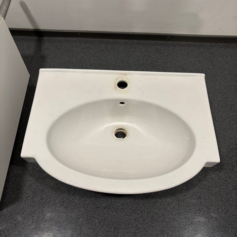 Valkoinen pesuallas kylpyhuoneeseen. Altaassa on valmiina pohjaventtiilin reikä ja ylivuotoaukko.