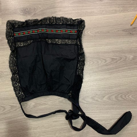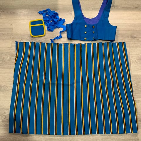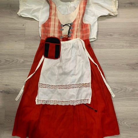 Lasten munsalan liivihame, tasku ja päänauha. 1 messinkinappi puuttuu. Mitat: olka-helma: 94cm, kääntövaraa helmassa noin 7cm. Kai-kai: 35cm, kyljissä suurennusvaraa n. 5cm per puoli. Olkaimissa n. 5 cm pidennysvaraa. Eläintalous.