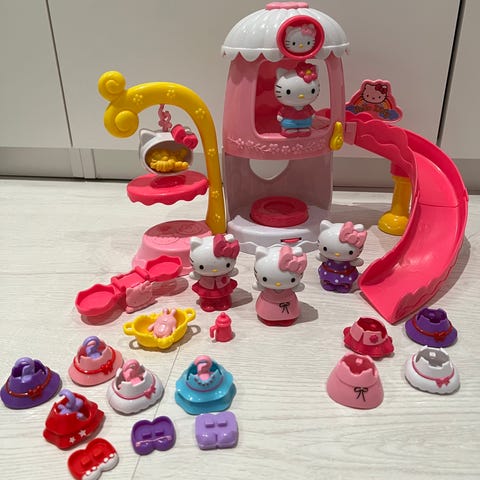 Hello Kitty leikkisetti ja seinäkello. Leikkisettiin kuuluu vaaleanpunainen liukumäki ja leikkitorni ja kolme pientä koiraa ja muita pikkuleluja, lisäksi vielä 6 pikku hello kitty hahmoa, myyn kellon tai pikkuhahmot erikseen mutta leikkitorni, koirat ja pienet tarvikkeet myyn vain yhdessä, koska ovat samaa settiä.