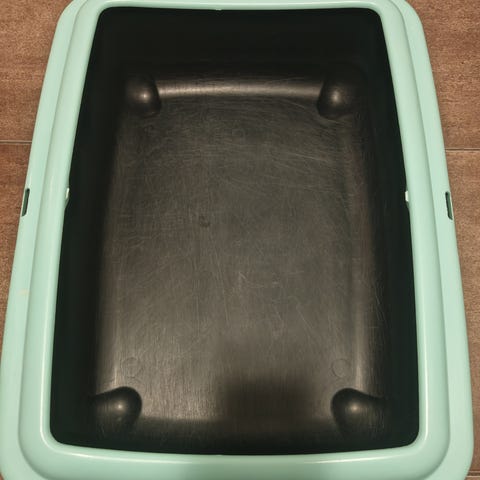 Kissanhiekkalaatikko. Laatikon pohjassa raapimajälkiä ja tahraa valkeasta hiekasta.