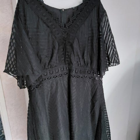 Musta ihanan kevyt takki juhliin. On pitkät pitsihihat ja edessä vetoketju. Helmassa ja yläosassa resorit.