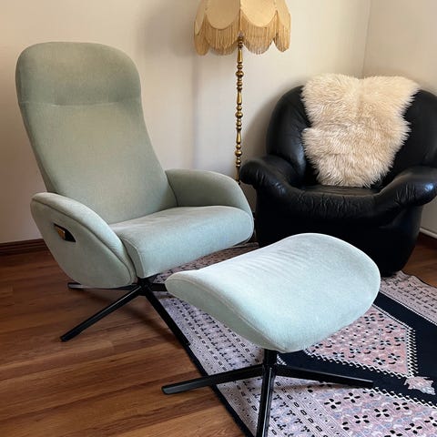 Hobby Hallista viime vuonna ostettu nojatuoli.Kaunis, hyväkuntoinen ja kevyt siirrellä.Kangas mukavan sileää velouria.