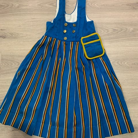 Lasten Munsalan kansallispuvun osia. Tästä oiva pukuprojekti ensi kesän juhliin. Liivi on ratkottu irti hameesta. Mukana tasku ja päänauha. Mitat: liivi olka-helma: 37, kai-kai: 38cm, hamekankaan leveys: 160cm, pituus 60cm.