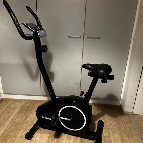 Karhu Blackline Pro kuntopyörä. Väri musta punaisilla yksityiskohdilla. Laitteessa on ohjaustankoon integroitu näyttö, josta voi seurata harjoittelun perusarvoja, kuten aikaa, matkaa ja arviolta kulutettuja kaloreita. Satula on korkeussäädettävä ja polkimissa on jalkahihnat. Soveltuu kotikäyttöön kuntoiluun ja peruskestävyysharjoitteluun.