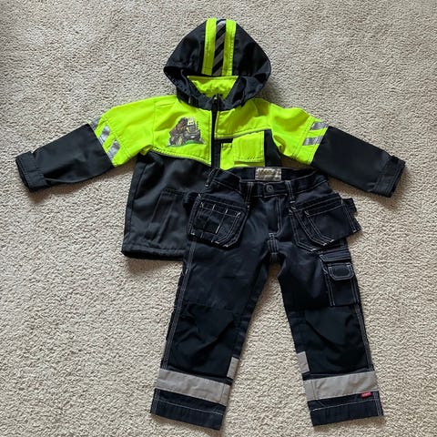 Biltemasta ostetut lasten "rakennumiehen" housut ja fleece-takki. Housut kokoa 110 ja takki 116.