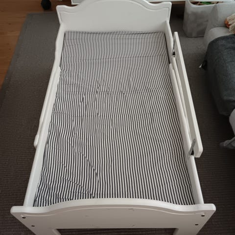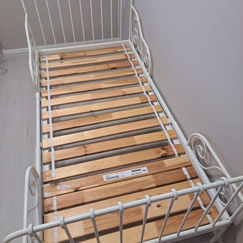 IKEA jatkettava lastensänky. Sängyssä on musta metallirunko ja puiset sälepohjat. Pituutta voi säätää lapsen kasvaessa 200cm:iin saakka. Sälepohjan saa mukaan, mutta se ei enää ihan ideaali.