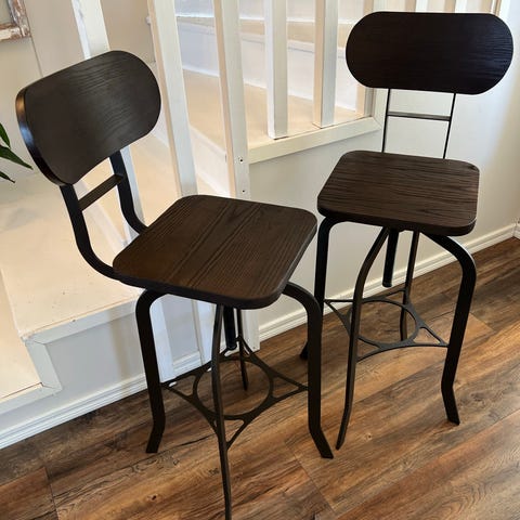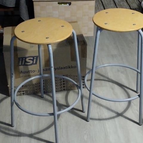 Myydään kaksi metallirunkoista jakkaraa, istuinosa puuta. Jakkarat sopivat korkeamman pöydän, esim. saarekkeen tuoleiksi. Korkeus 66 cm. Korkeutta ei voi säätää. Myydään molemmat tuolit yhdessä.