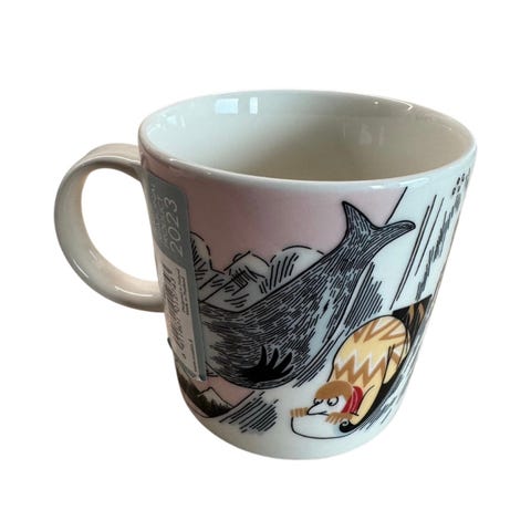 Kevyesti käytössä ollut yleisilmeeltään siisti muki. Kahva valitettavasti halki yläreunasta, joten joutaa hyllylle ihailtavaksi ennemmin kuin käyttöastiaksi. Halkeama näkyy viimeisessä kuvassa.