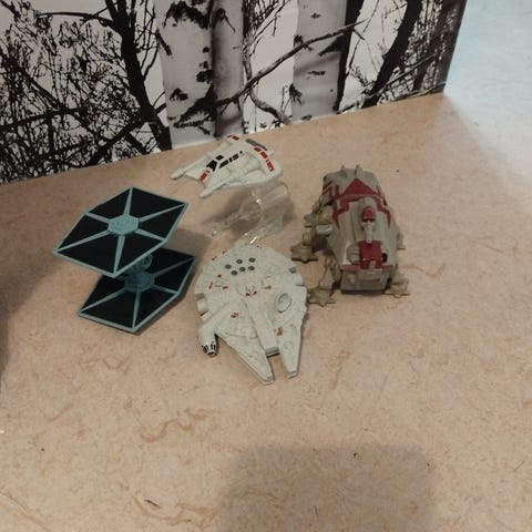 Star Wars TIE Fighter leluavaruusalus. Harmaa‑musta muovinen alus, jossa on avattava ohjaamo. Siivet saa irrotettua napeista. Kunto hyvä, pieniä jälkiä säilytyksestä.