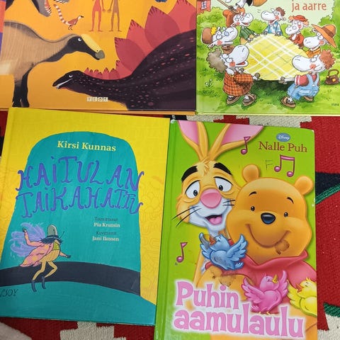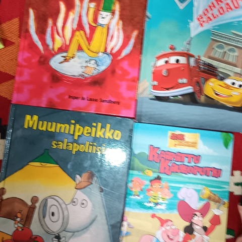 Pakkaus sisältää neljä paksusivuista lastenkirjaa pienille lapsille. Kirjat ovat värikkäitä kuvakirjoja, joissa on yksinkertaisia tekstejä ja arkeen liittyviä aiheita. Osaa kirjoista on jo luettu paljon ja niitä on jouduttu korjaamaan ja teippaamaan, toimivat silti edelleen hyvin mukaviin lukuhetkiin. Kaikki pakettina yhteishintaan.