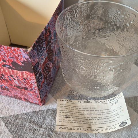 Hienossa kunnossa oleva kulho. Pohjassa näkyy pieni ilmakupla ja valossa heijastuu muutama pieni/ hento naarmu.