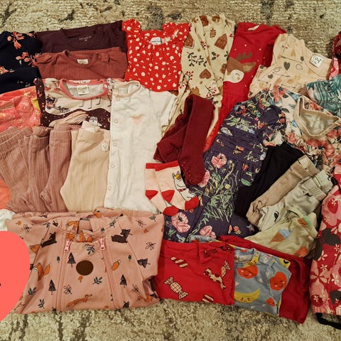 Pääosin todella hyväkuntoisia vaatteita, jossain voi olla ehkä pientä haalistumaa tai vastaavaa (mm. sukkien väri tummunut). Merkkejä ainakin: Moomin by martinex, Mayoral, Peuhu ym.