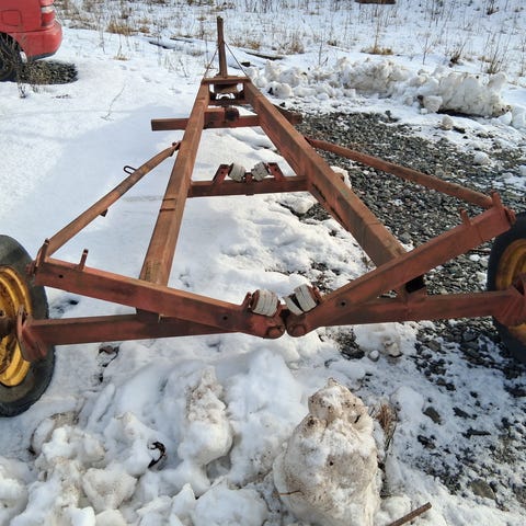 Jonkun kyläsepän tekemä kärry moneen tarkoitukseen, aukeavat laidat, kippi mahdollisuus, korokeverkot. Mitat 1700 x 3400
