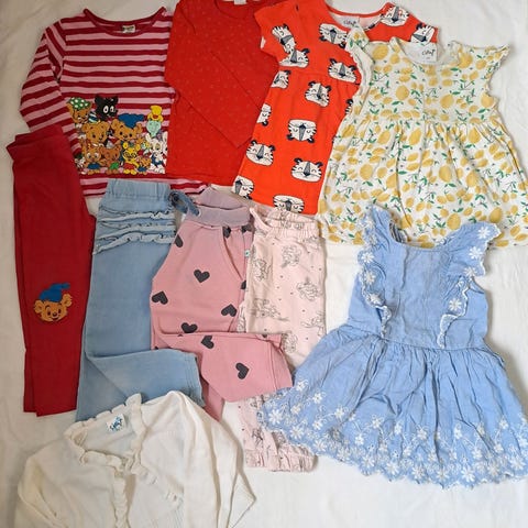 Lastenvaatepaketti tytöille, koko 92. Paketissa useita erivärisiä ja -kuvioisia vaatteita, kuten pitkähihaisia puseroita ja pyjamahaalareita. Värit ovat kirjavia ja sopivat noin 92 cm pitkälle lapselle. Materiaali on todennäköisesti puuvillaa tai puuvillasekoitetta, kuten tämän ikäisten lasten vaatteissa yleensä. Soveltuu arki- ja leikkikäyttöön tytöille, jotka käyttävät kokoa 92.