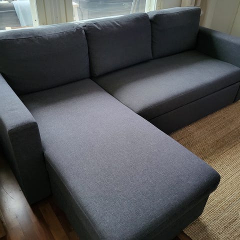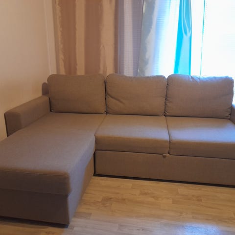 Harmaa, jämäkkä vuodesohva divaanilla. Divaaniosan alla iso säilytystila. Parivuoteeksi levitettävä. Hyvä nukkua. Ollut käytössä vuoden.