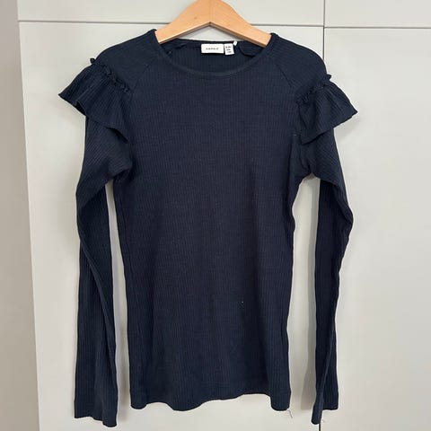 NameIt musta trikoopaita, kauluksessa pitsi. Koko 134-140. Materiaali: 58% puuvilla, 37% modaali, 5% elastaani