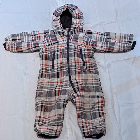 Kohtalaisessa kunnossa oleva H&M:n toppahaalari tähtikuviolla, irrotettavalla hupulla ja fleecevuorilla. Jalkalenksut ehjät. Hihan- ja lahkeensuut hieman rispaantuneet ja toista kainaloa parsittu, kts. viimeiset kuvat. Aivan toimiva vielä vaikka rymy- tai päiväkotihaalariksi.